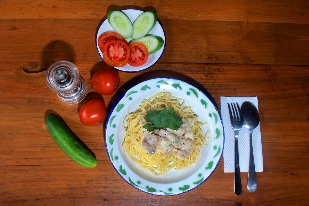 Tak hanya Mie Kuah dalam Batok, Sphagetti Carbonara yang biasanya disajikan dengan plating yang elegan, di sini penyajiannya justeru lebih sederhana yaitu menggunakan piring seng motif daun khas zaman dulu. Unik, bukan? 😉
