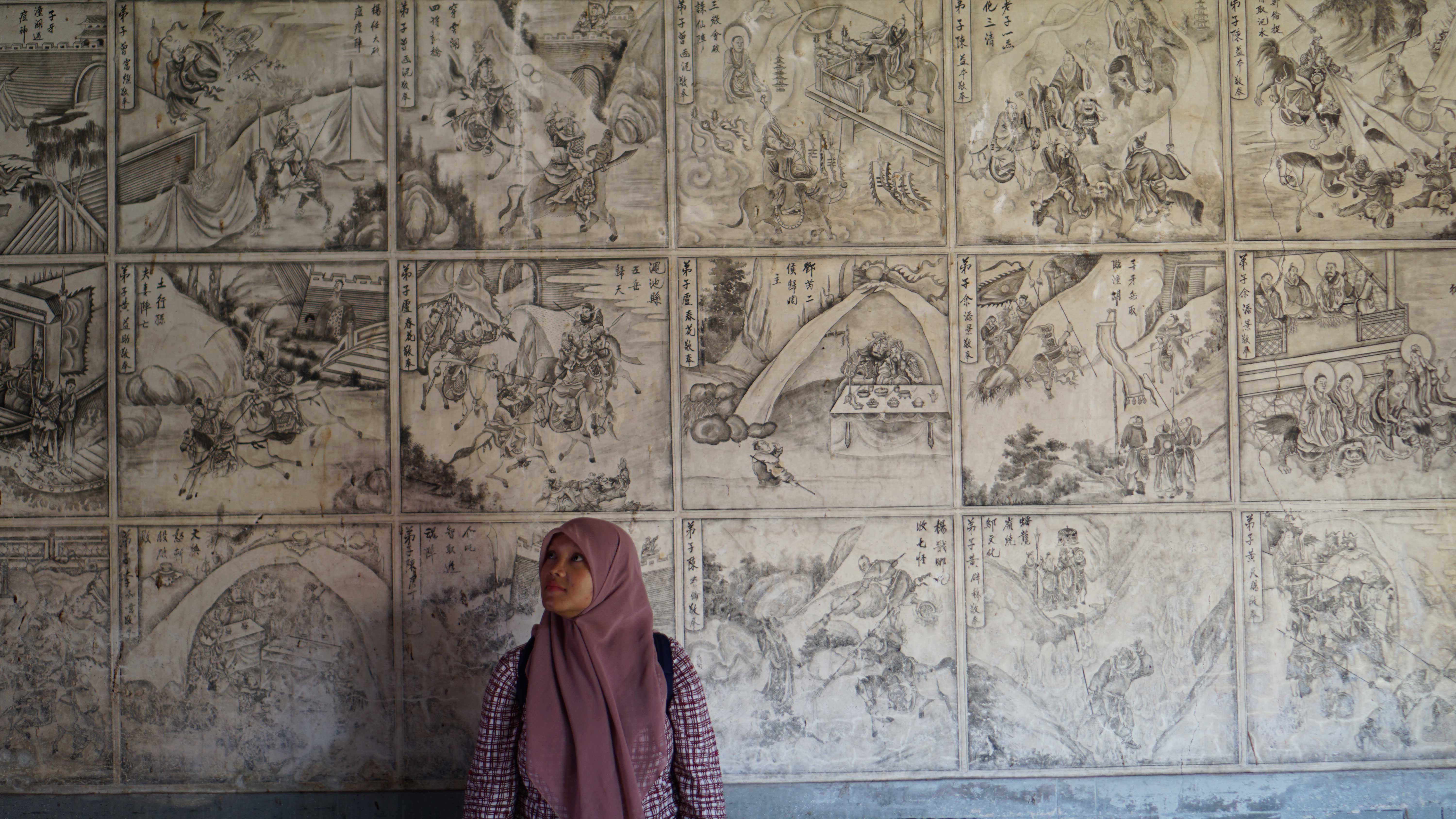 Memasuki ruang tengah, aku kembali terkagum dengan mural monokrom. Mural 100 panel ini tergores pada kanan dan kiri dinding. Mural ini mengisahkan tentang Fangshen Yanyi (kisah terciptanya desa-dewi) yang diambil dari ‘komik’ Fangshen Yanyi atau kisah mitologi Dewa-Dewi Taois karya Xu Zhonglin. Saking detailnya torehan tinta pada mural tersebut, sampai sekarang mural masih terlihat dengan jelas dan bagus banget. Makanya, masuk dalam Rekomendasi Obyek Wisata di Lasem.